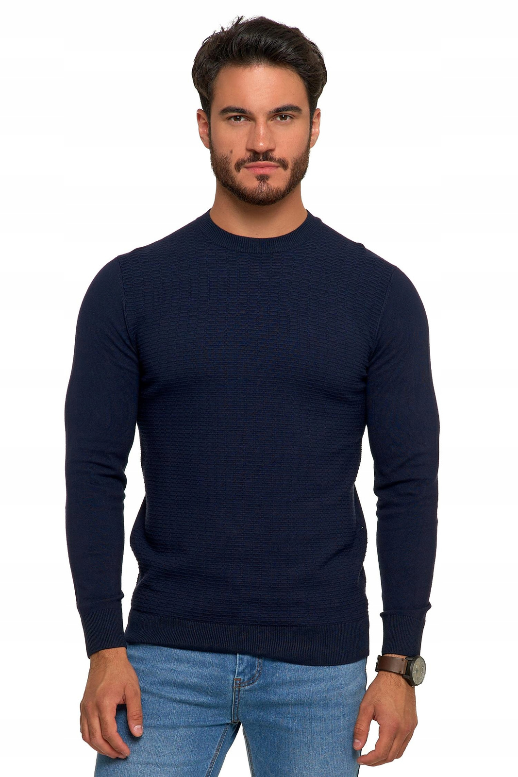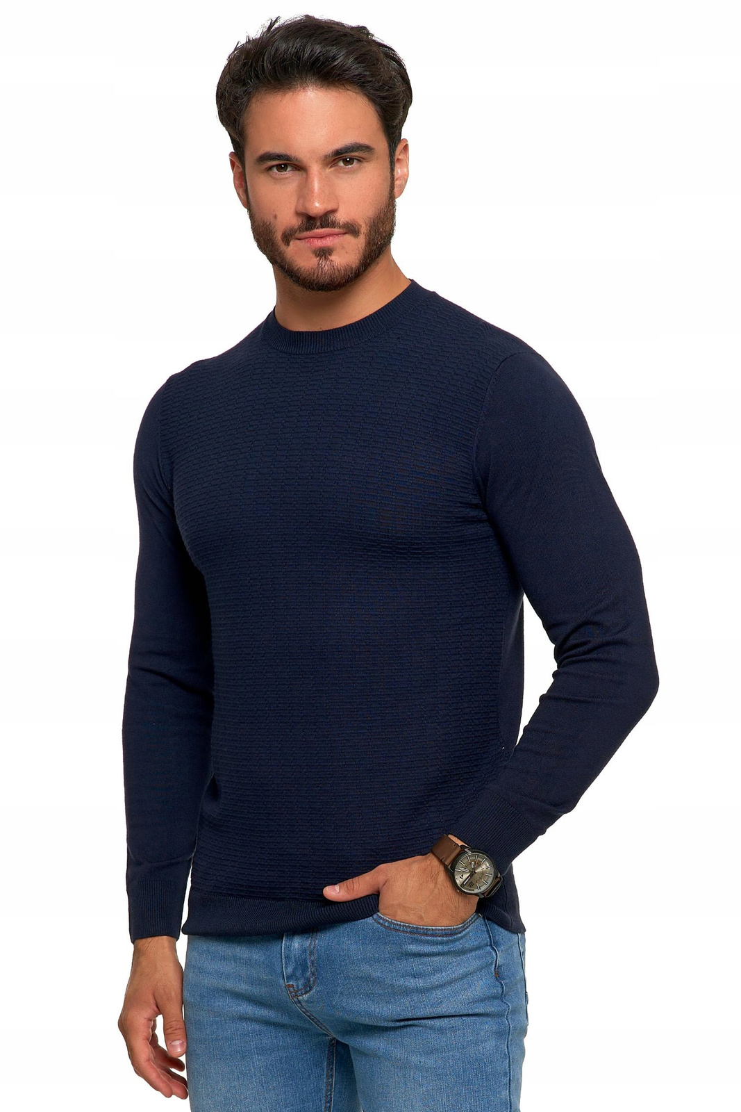 W naszym swetrze z okrągłym dekoltem i drobnym wzorem poczujesz się elegancko i komfortowo jednocześnie. To doskonały wybór dla mężczyzn ceniących wysoką jakość i niepowtarzalny design.