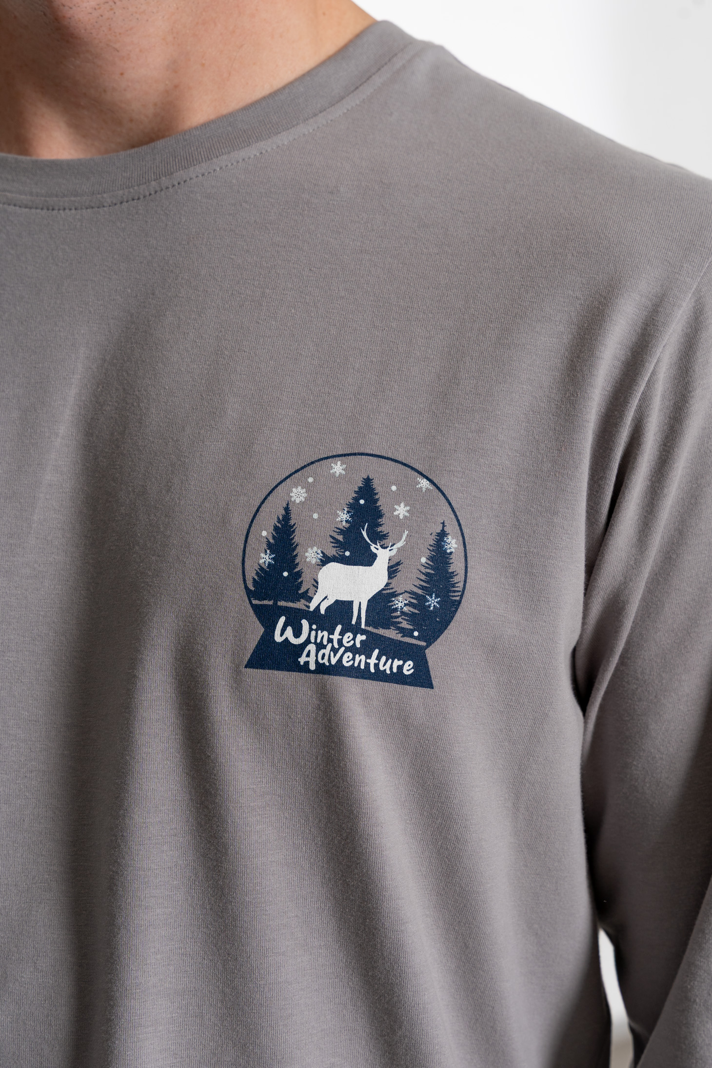 Góra: W odcieniu chłodnej szarości, z długim rękawem. Klasyczny fason z okrągłym dekoltem bez guzików zapewnia prostotę. Ozdobiona subtelnym nadrukiem "Winter Adventure" na piersi.