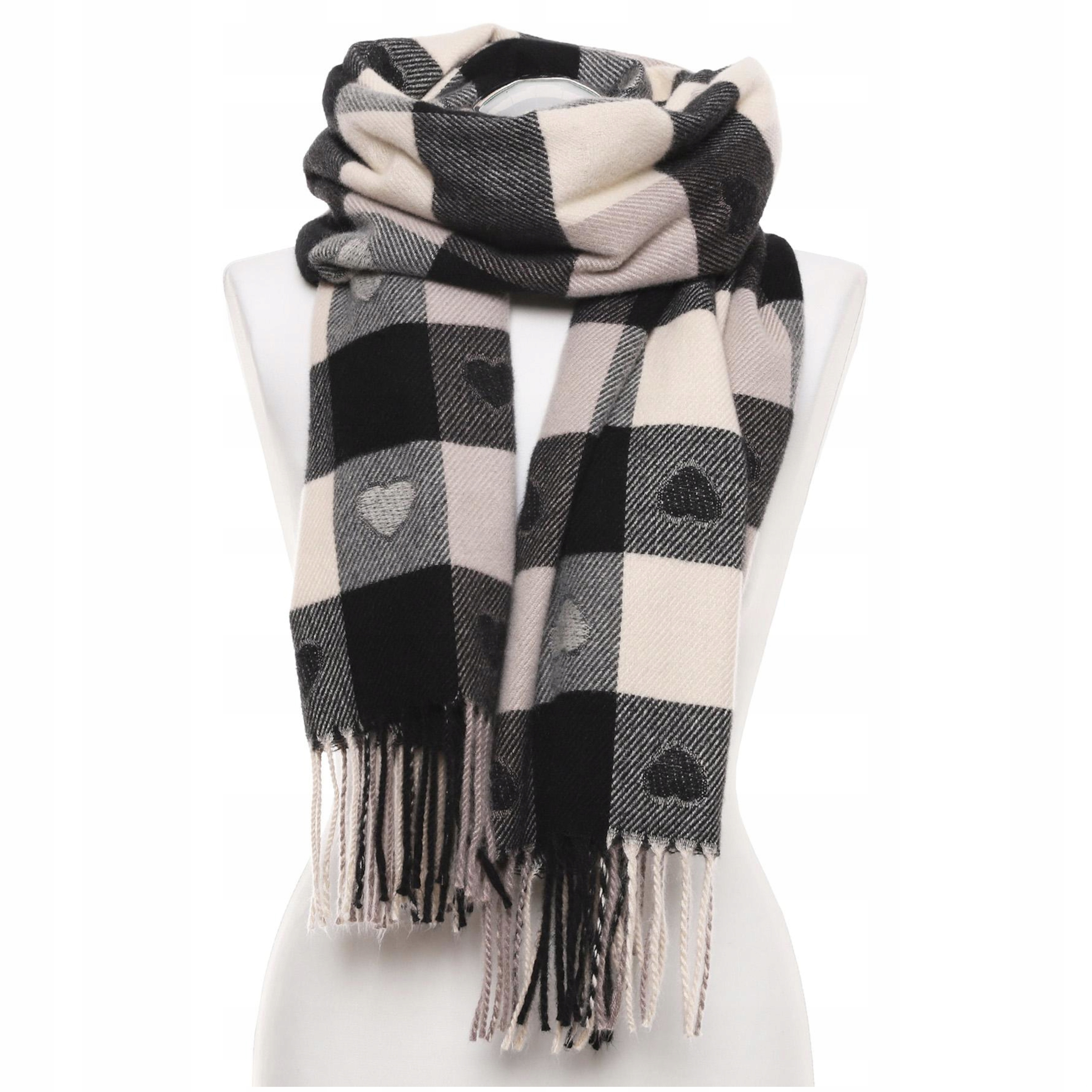 Szal Ciepły z Frędzlami w Kratę z Serduszkami Elegancki Modny MORAJ