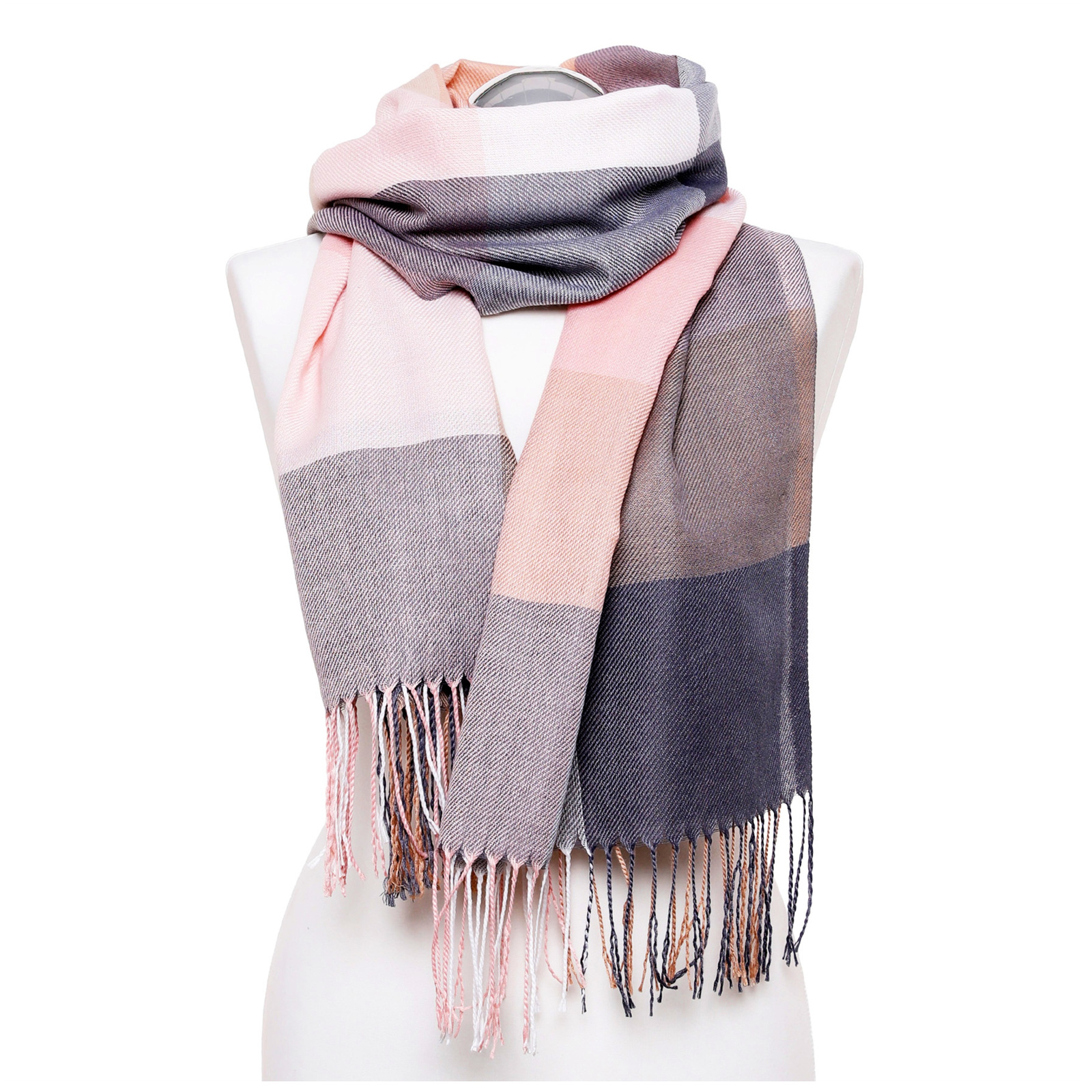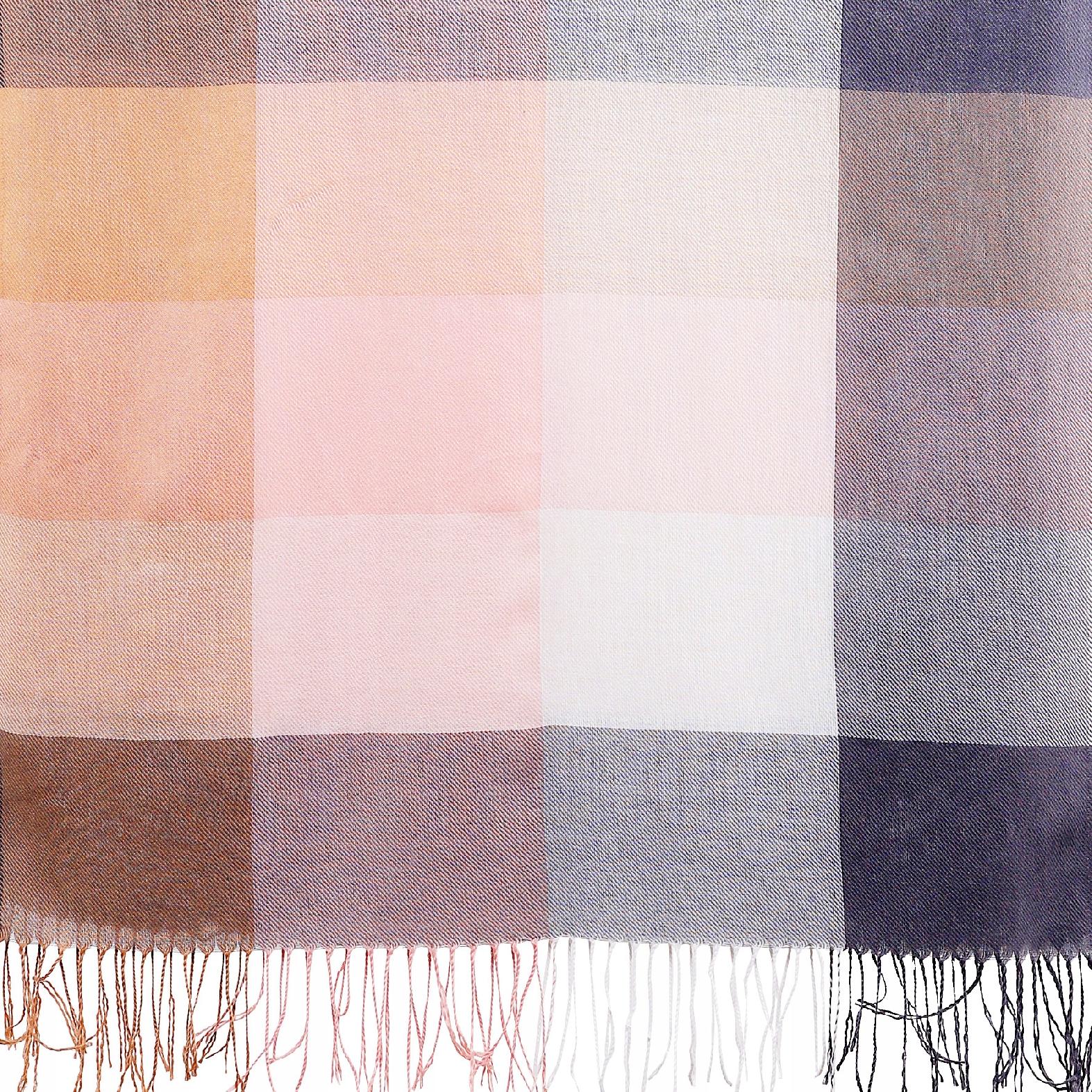 Wykonany z miękkiego materiału, doskonale otula szyję i ramiona, zapewniając ciepło oraz komfort noszenia. Klasyczny wzór w kratę łączy odcienie beżu, pudrowego różu, bieli i szarości, co sprawia, że szal pasuje do wielu stylizacji - zarówno casualowych, jak i bardziej eleganckich. Subtelne frędzle na zakończeniach dodają mu lekkości i modnego charakteru. Dzięki swoim wymiarom szal można nosić na wiele sposobów - jako klasyczne okrycie na szyję, narzutkę na ramiona lub stylowy akcent do płaszcza czy kurtki.