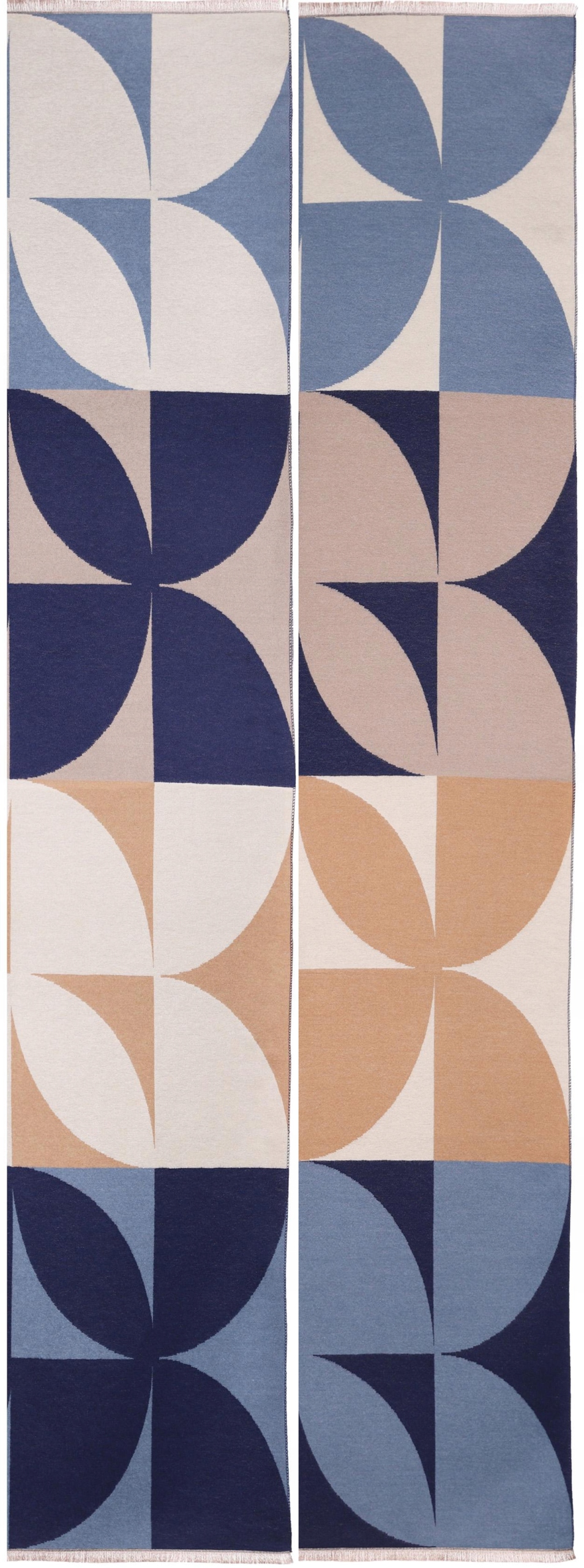 Wykonany z miękkiego materiału przypominającego kaszmir, zapewnia ciepło i wyjątkowy komfort noszenia, idealny na chłodniejsze dni jesieni i zimy. Dwustronny wzór szala wyróżnia się geometrycznymi kształtami, które układają się w harmonijną kompozycję. Dominują tu spokojne odcienie granatu, beżu i szarości, które nadają mu elegancki i uniwersalny charakter. Dzięki dwustronnemu designowi, szal można nosić na różne sposoby, zmieniając strony, by dopasować go do różnorodnych stylizacji.