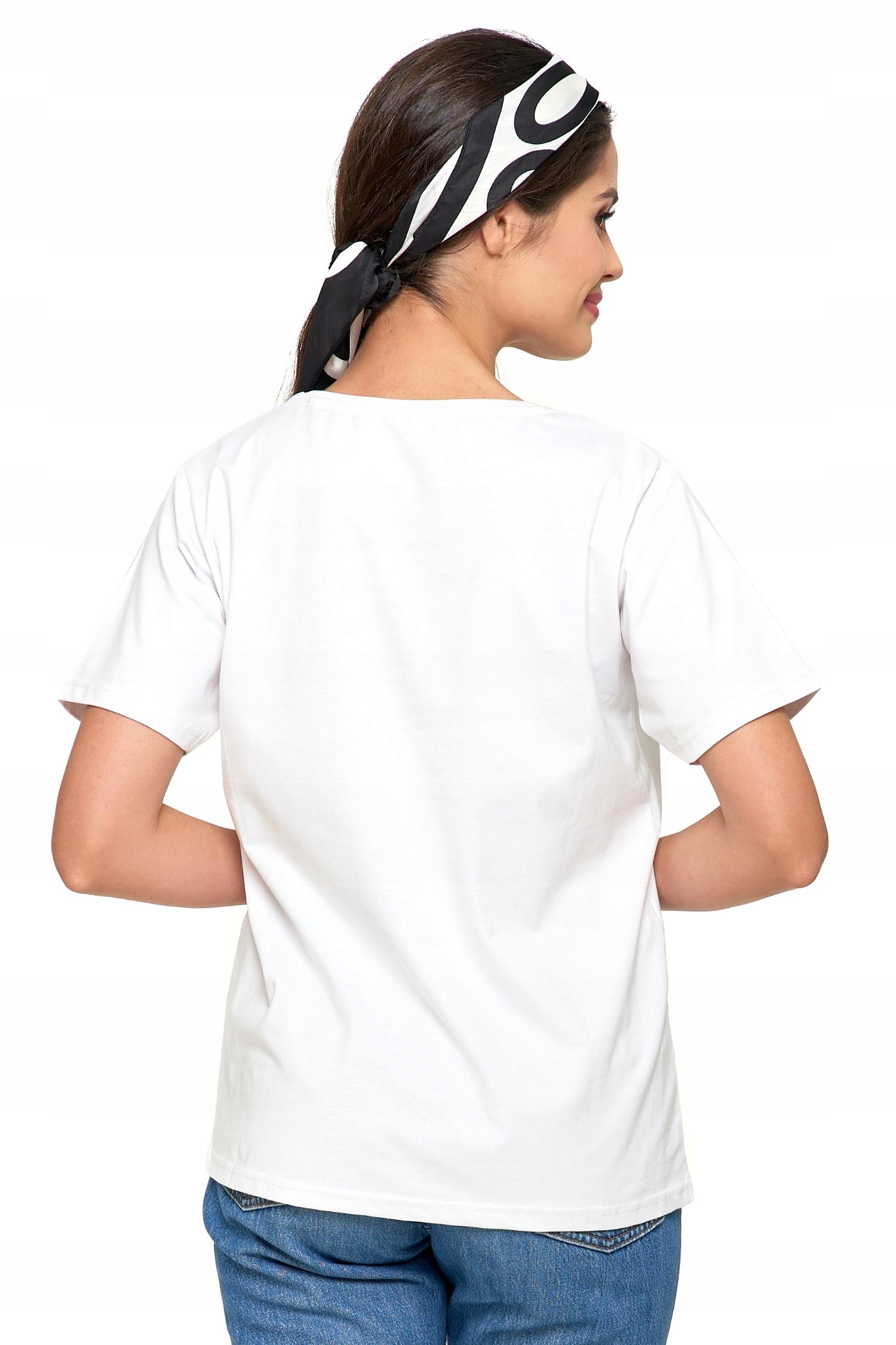 T-shirt ma regularny krój, który idealnie dopasowuje się do kobiecej sylwetki, podkreślając jej atuty.