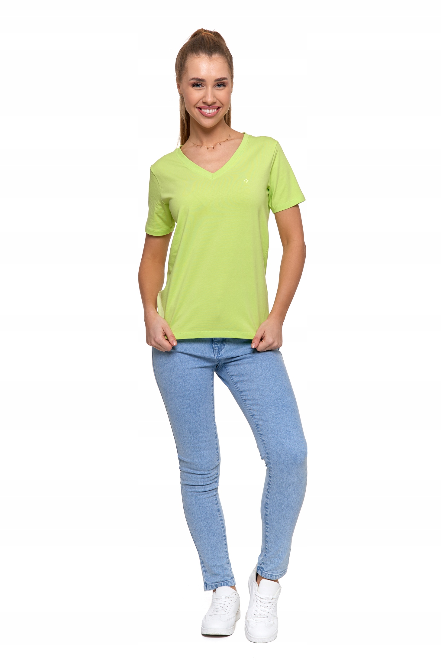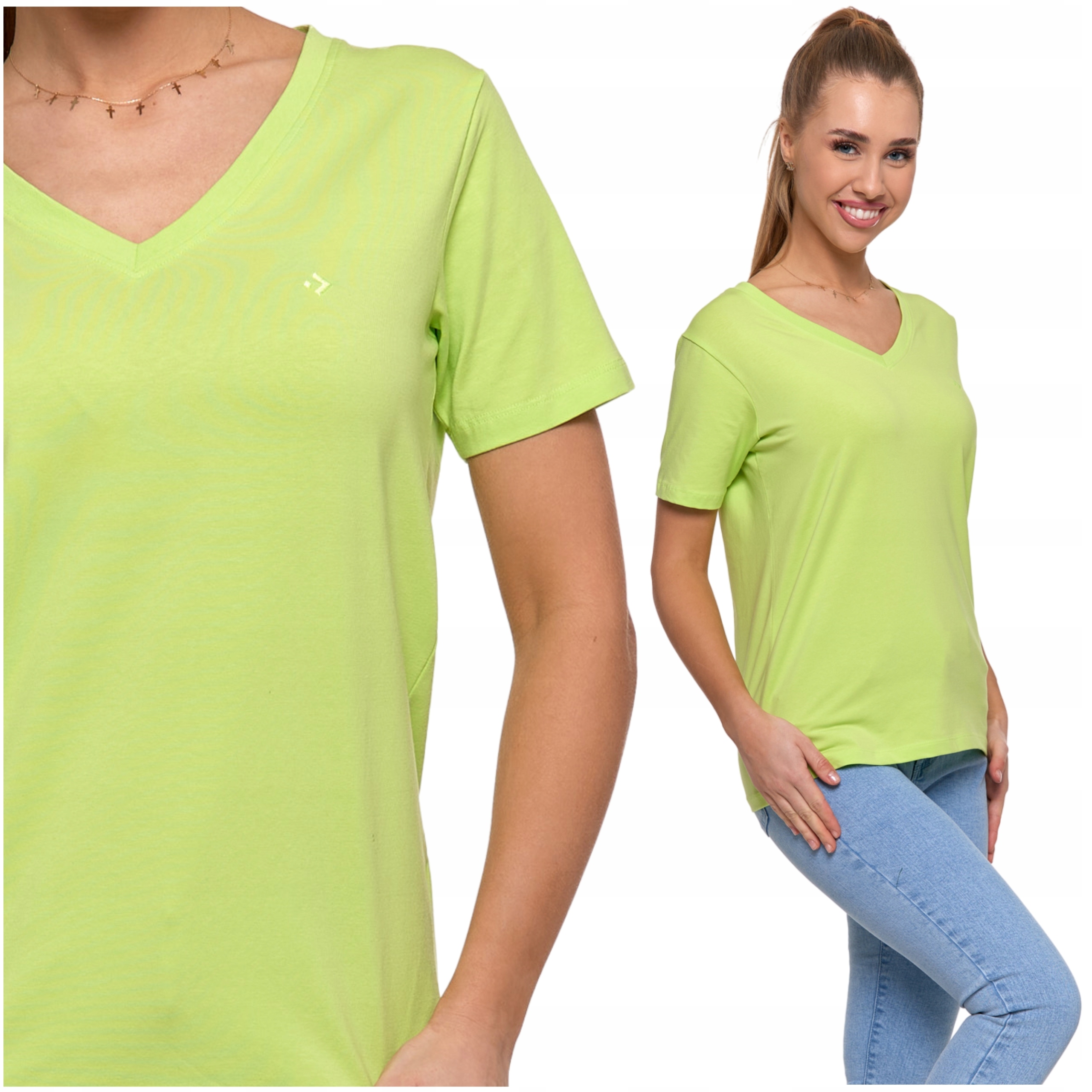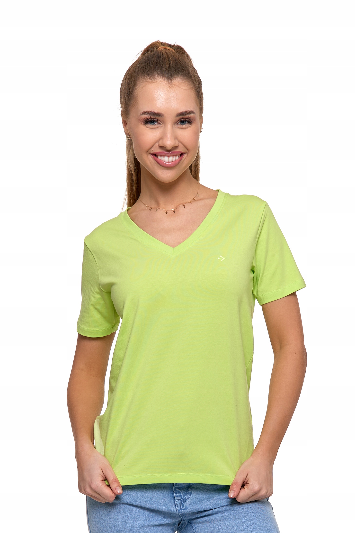 T-shirt ma regularny krój, który idealnie dopasowuje się do kobiecej sylwetki, podkreślając jej atuty. Dekolt w kształcie litery V dodaje koszulce elegancji i kobiecości, a jednocześnie sprawia, że wygląda ona bardzo modnie i stylowo.