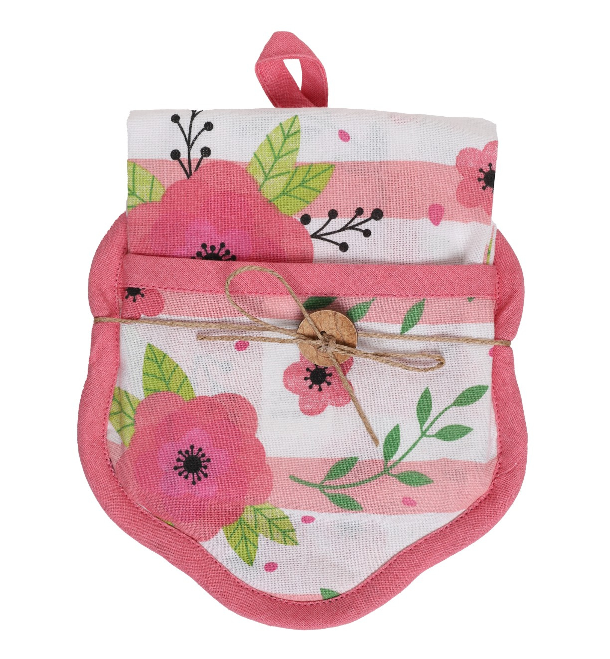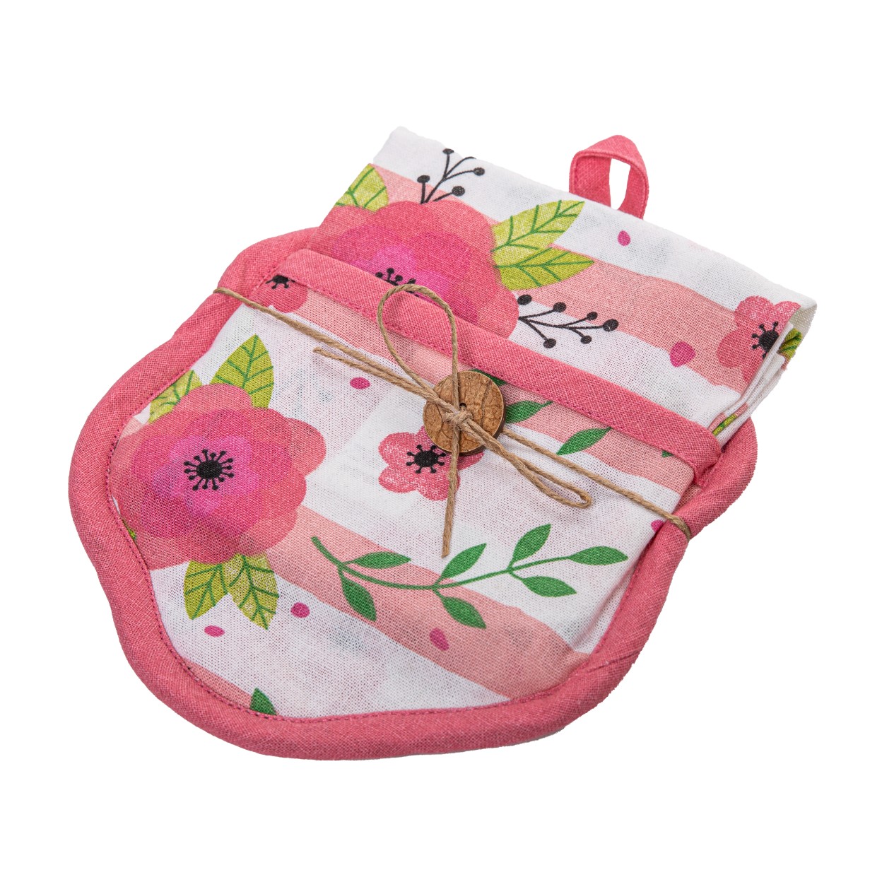 Ten uroczy zestaw kuchenny to pojedynczy ręcznik/ścierka w kwiaty, zapakowany w estetyczne opakowanie – idealny, by wnieść świeży, kwiatowy akcent do kuchni lub posłużyć jako gotowy upominek.