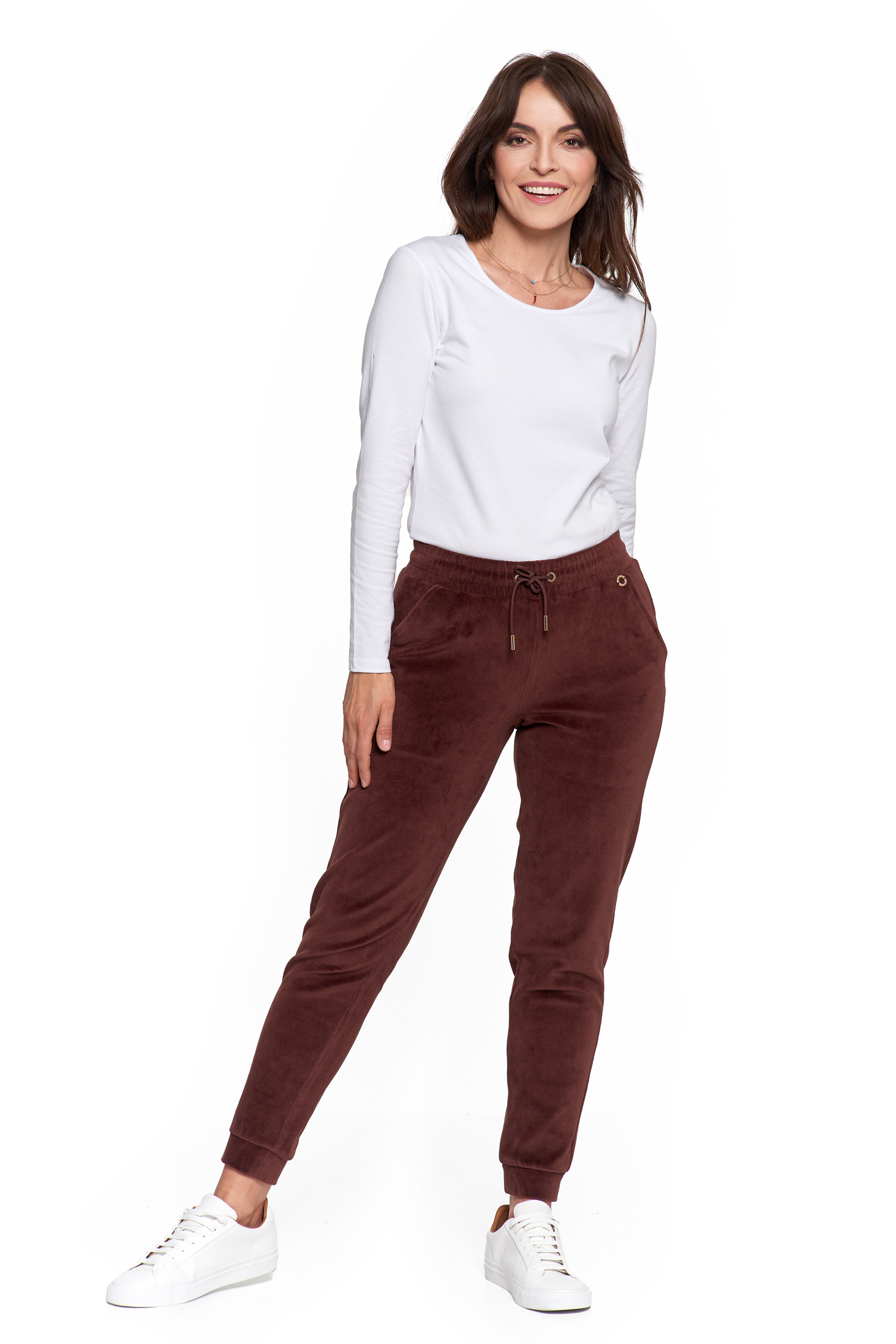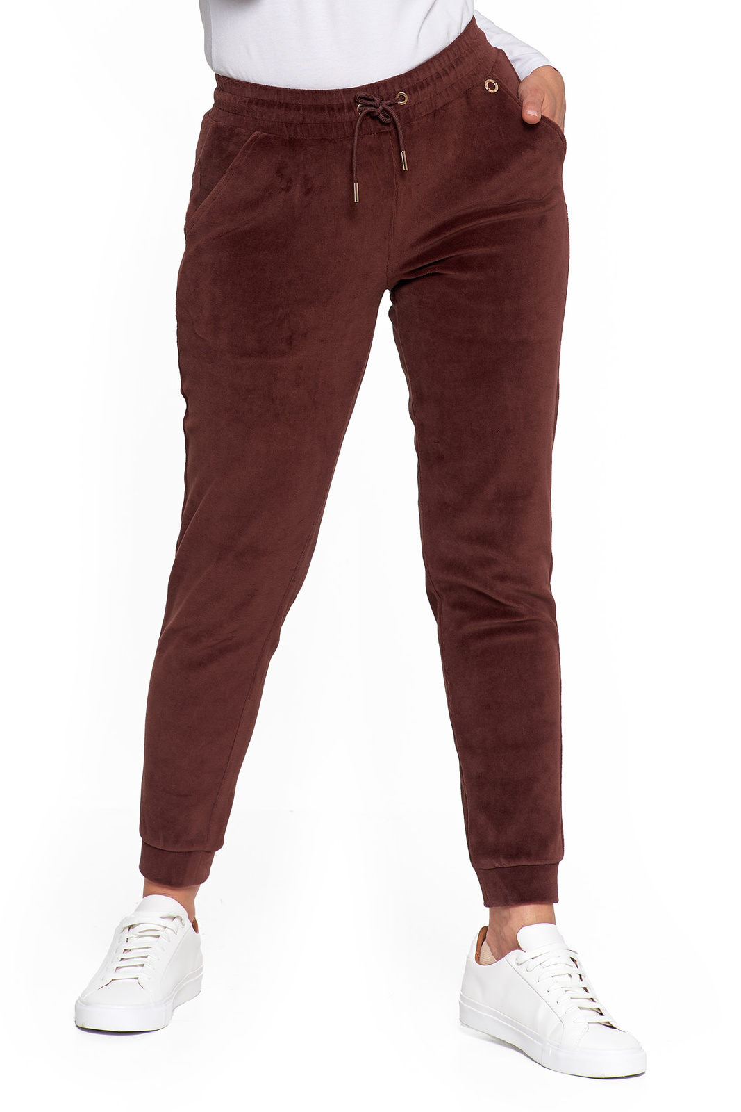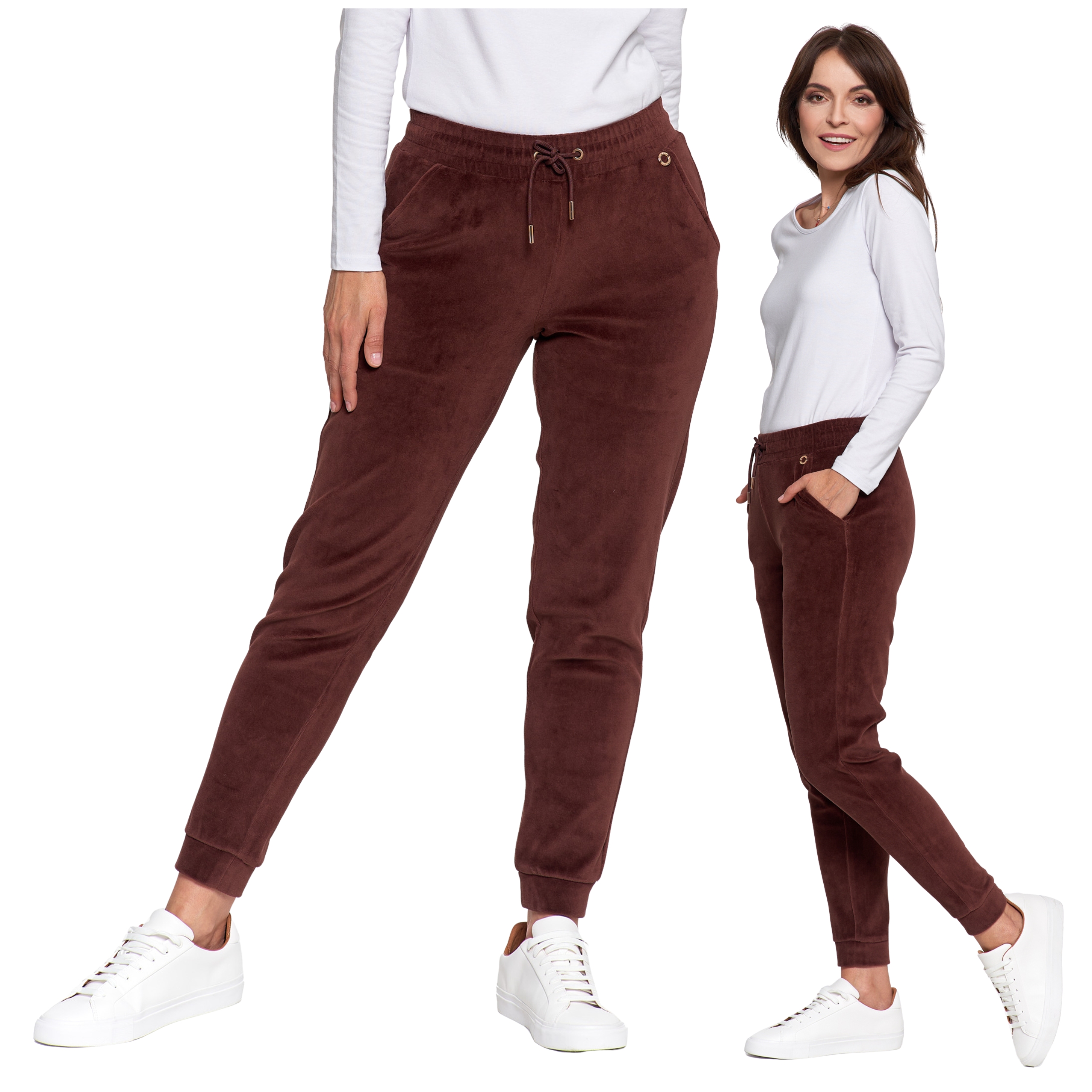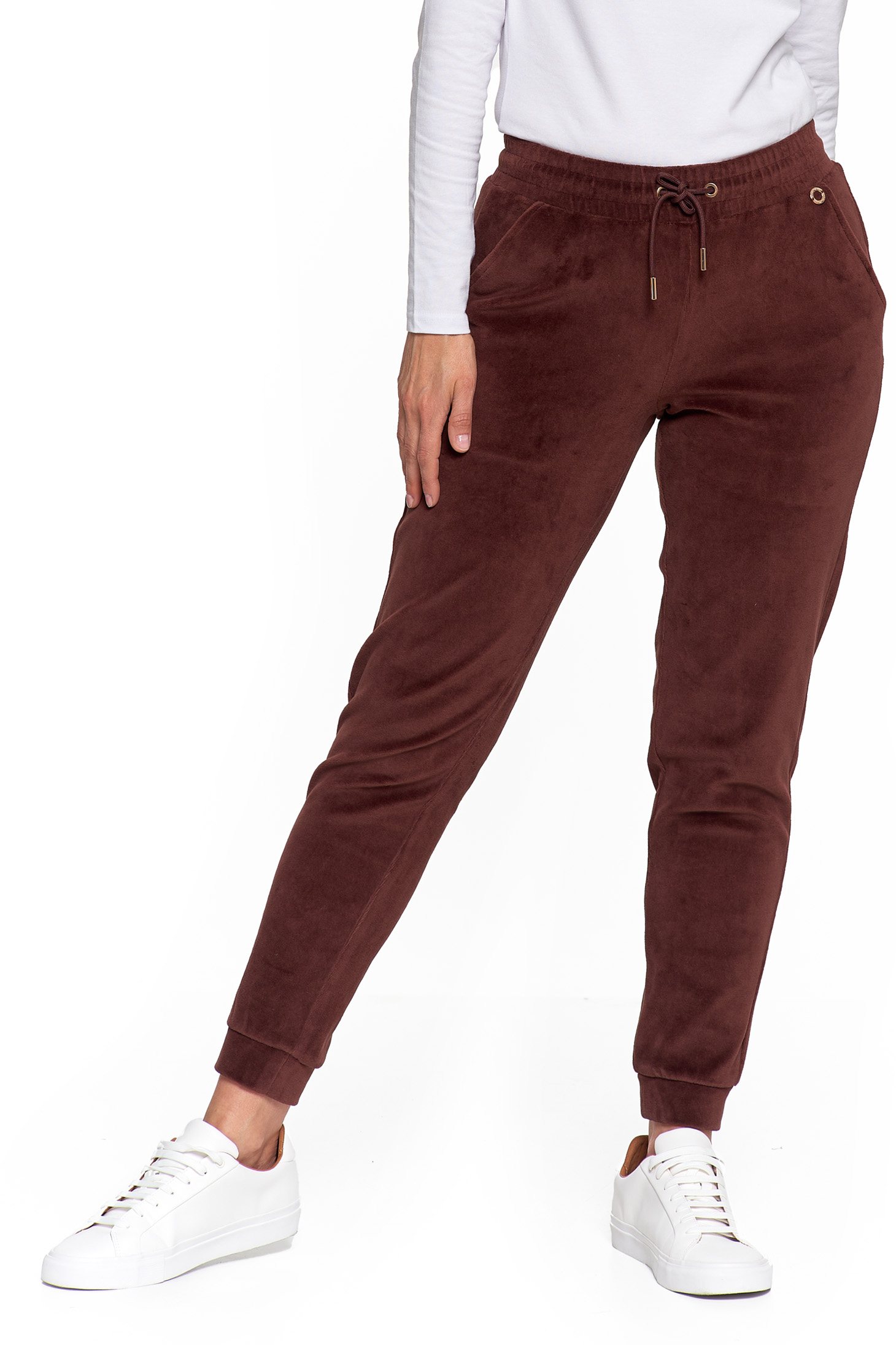 Te damskie spodnie dresowe to idealne połączenie wygody i elegancji w codziennym wydaniu. Wykonane z miękkiej dzianiny welurowej z bawełny czesanej, otulają ciało przyjemną miękkością, jednocześnie gwarantując naturalną przewiewność i wytrzymałość.