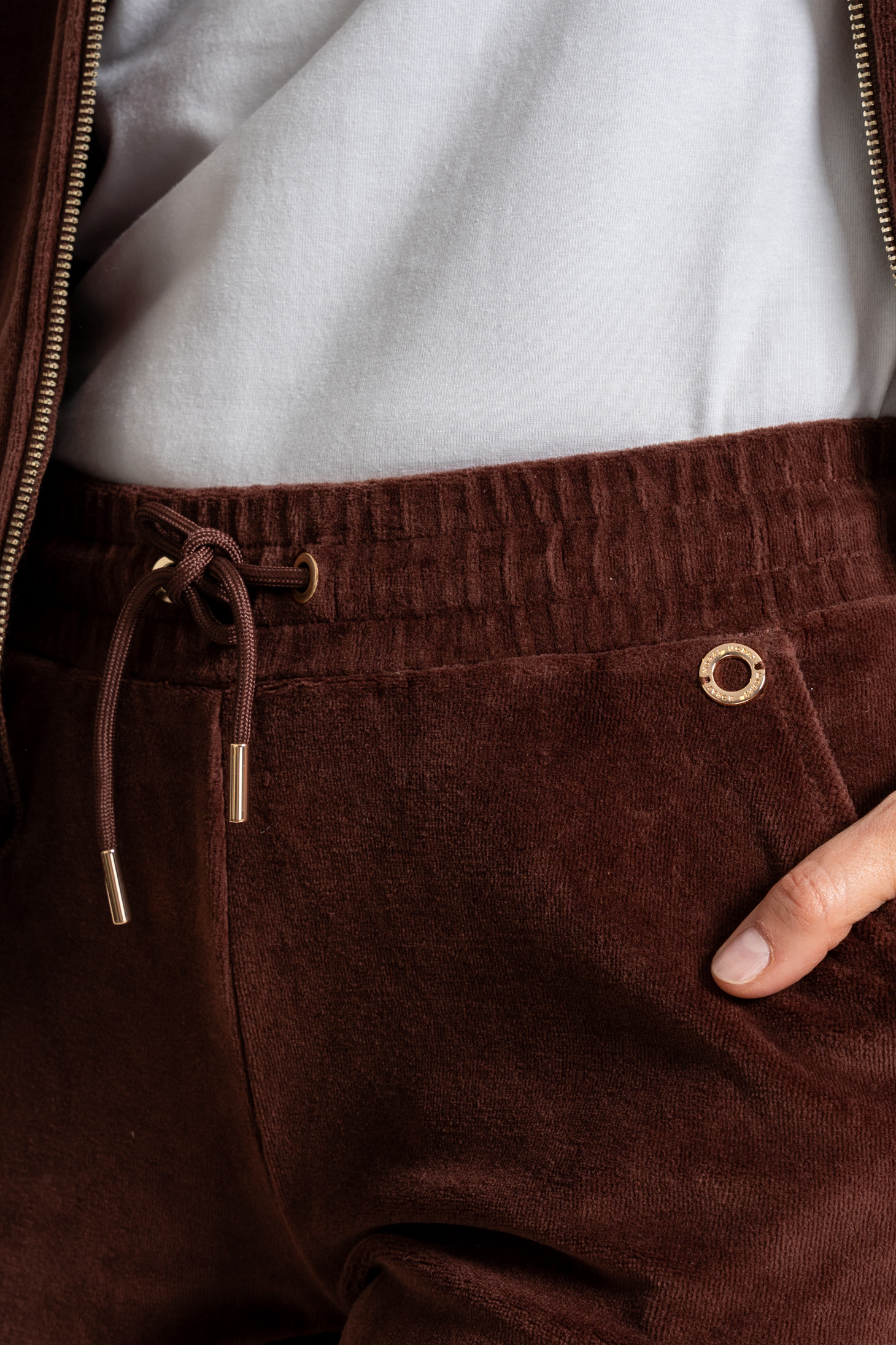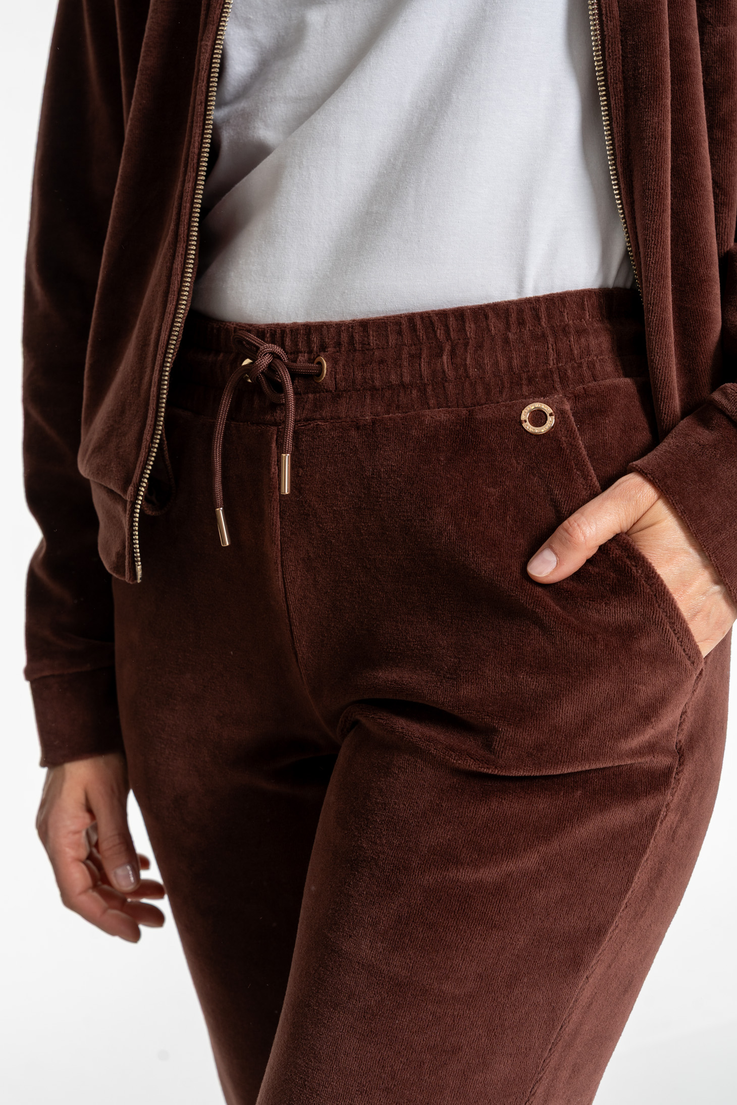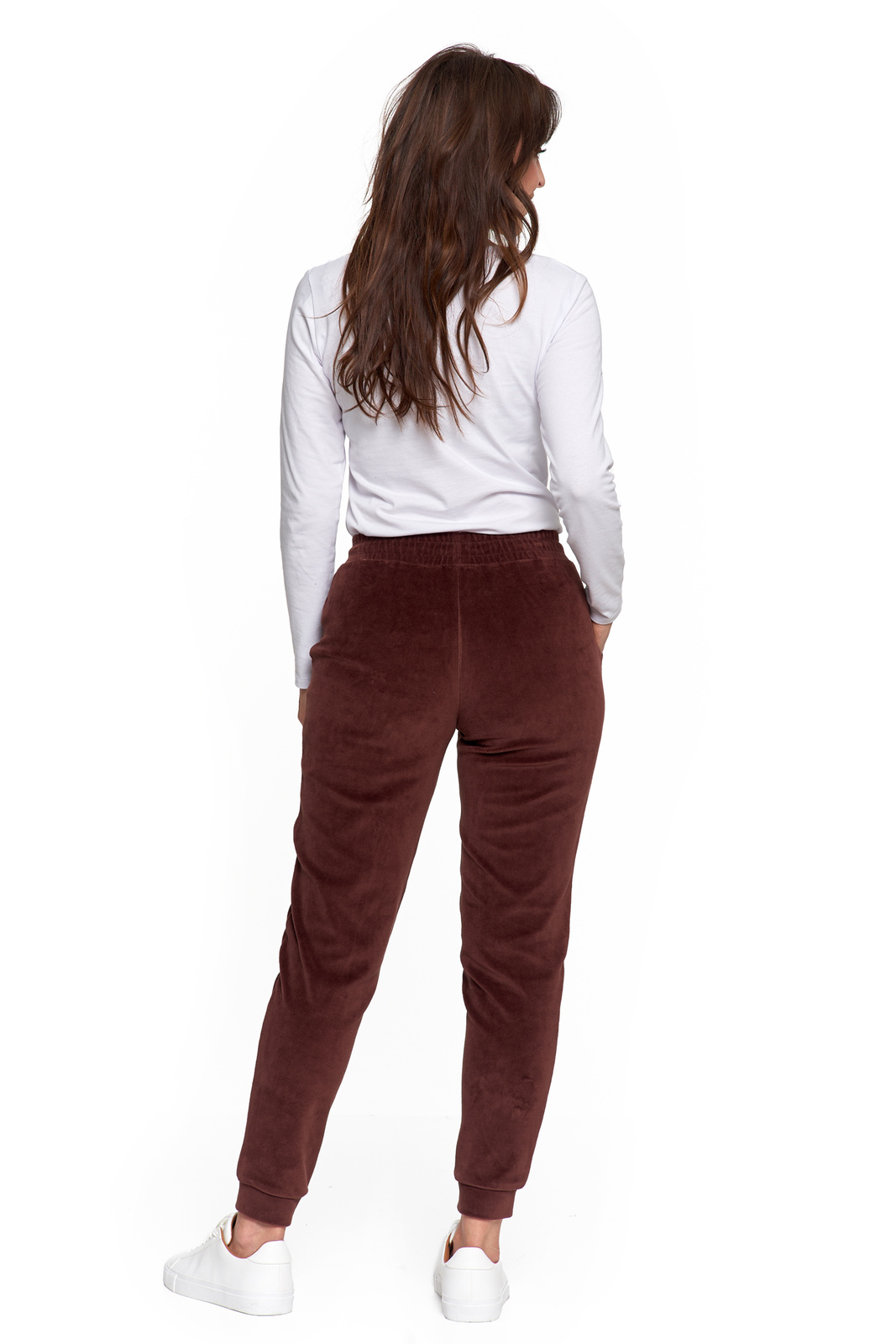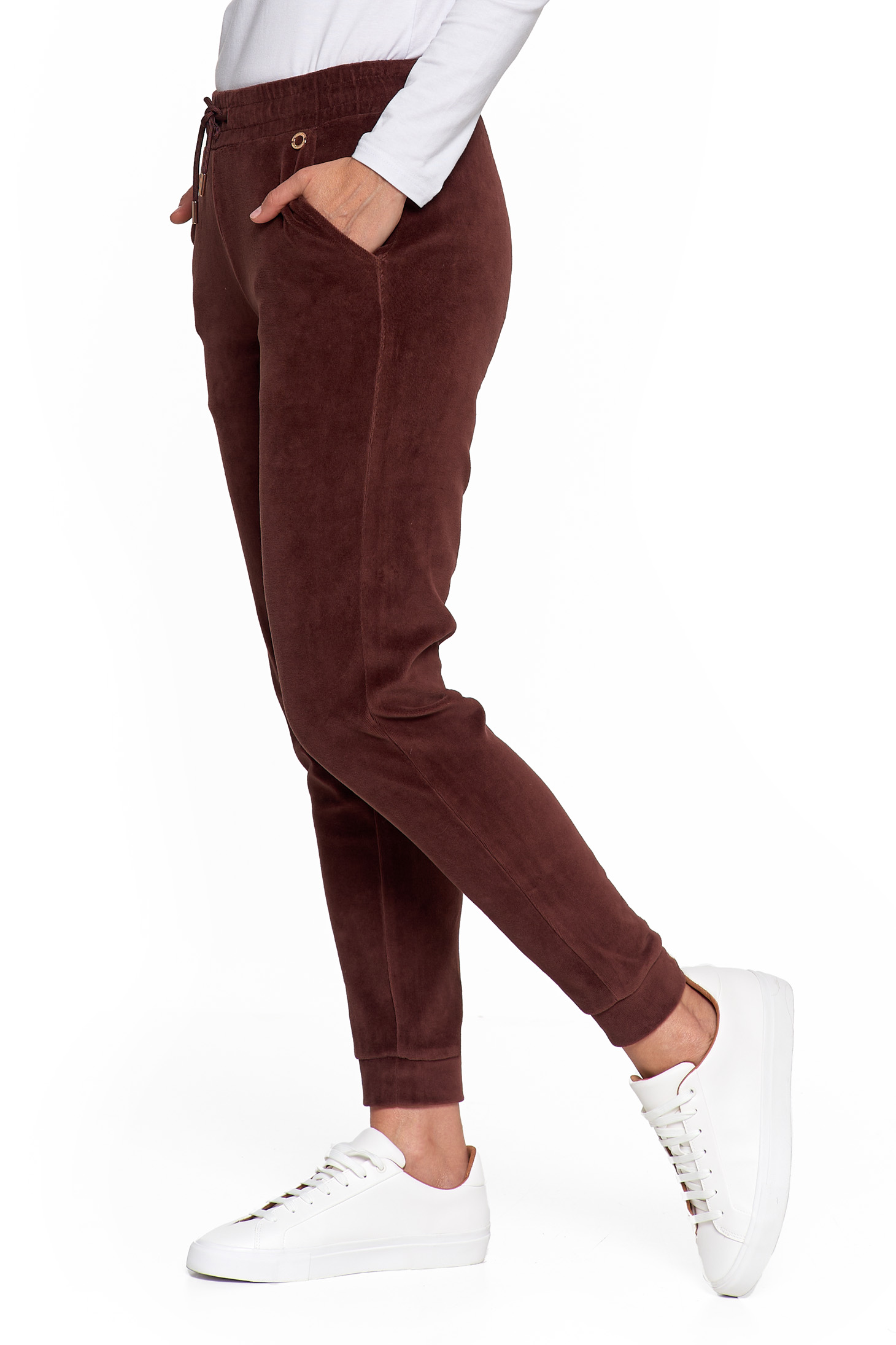 Te damskie spodnie dresowe to idealne połączenie wygody i elegancji w codziennym wydaniu. Wykonane z miękkiej dzianiny welurowej z bawełny czesanej, otulają ciało przyjemną miękkością, jednocześnie gwarantując naturalną przewiewność i wytrzymałość.