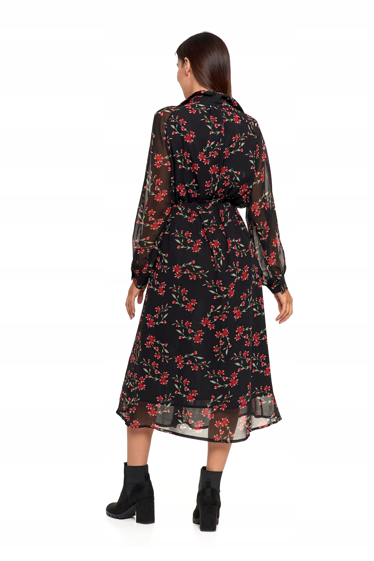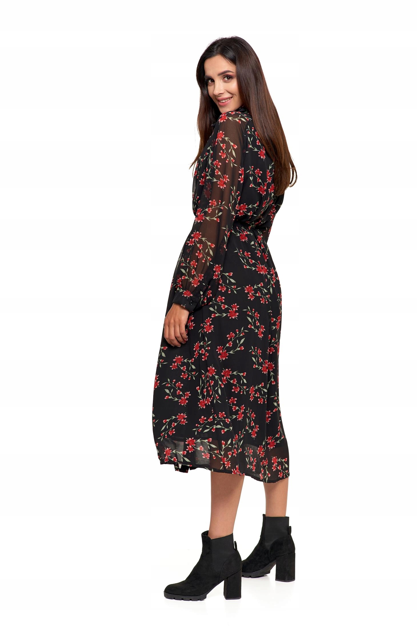Ozdobiona jest efektownym wiązaniem w okolicy dekoltu. To nie tylko dodaje jej uroku, ale także umożliwia dostosowanie sukienki do swojej sylwetki. Wyposażona w praktyczne kieszenie, umożliwia przechowywanie niezbędnych drobiazgów, takich jak klucze czy telefon, bez konieczności noszenia dodatkowej torebki. Posiada transparentne rękawy z możliwością regulacji mankietu. Sukienka posiada podszewkę, co zapewnia nie tylko wygodę, ale również zapobiega prześwitom.